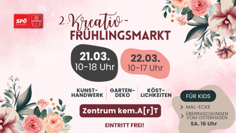 Lass dich von einer vielfältigen Auswahl an handgefertigten Kunstwerken und kreativen Ideen unserer zahlreichen Aussteller:innen inspirieren, genieße köstliche Leckereien und entdecke wunderschöne Gartendeko! - Im Café “Spring” erwarten dich hausgemachte Mehlspeisen, Kaffee und erfrischende Getränke. - Malecke für die Kids - Highlight am Samstag: Um 16:00 Uhr besucht uns der Osterhase und bringt für alle Kinder eine kleine Überraschung mit! Sei dabei und starte den Frühling mit uns! Wir freuen uns auf dich! Das Team der SPÖ Kematender SPÖ Kematen