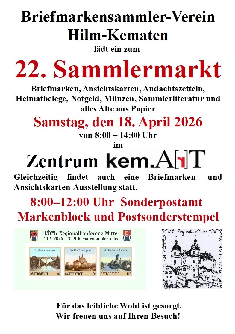 Alles was das Sammlerherz begehrt, bietet der bereits 22. Sammlermarkt des Briefmarkensammlerverein Hilm-Kematen im Zentrum Kem.A[r]T. Verkauft und getauscht wurden Ansichtskarten, Briefmarken, Heimatbelege, Münzen uvm. Beste fachmännische Beratung garantiert Vereinsobmann Horst Steindl. Darüberhinaus ist für das leibliche Wohl der Besucher bestens gesorgt. Gleichzeitig findes auch eine Briefmarken- und Ansichtskarten-Austellung statt.