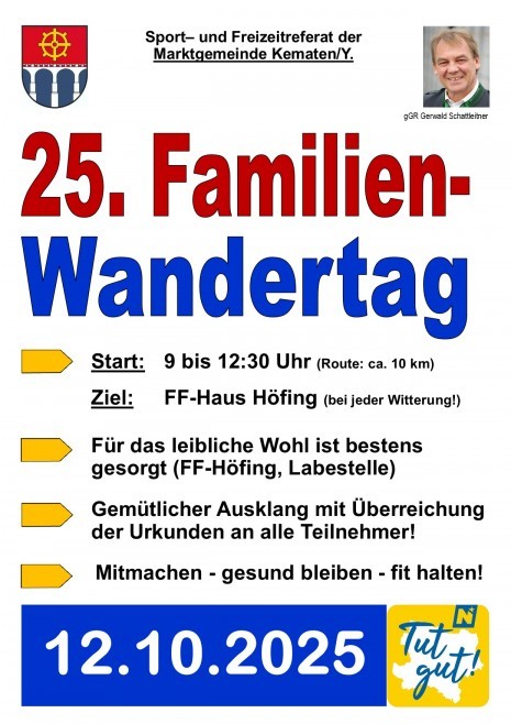 Unter dem Motto „Mitmachen – gesund bleiben – fit halten!“ lädt das Sport- und Freizeitreferat zur Teilnahme am 25. Kematner Familienwandertag herzlich ein! Rund um Kematen/Ybbs lässt sich die landschaftliche Schönheit des Mostviertels im Herbst eindrucksvoll erleben.