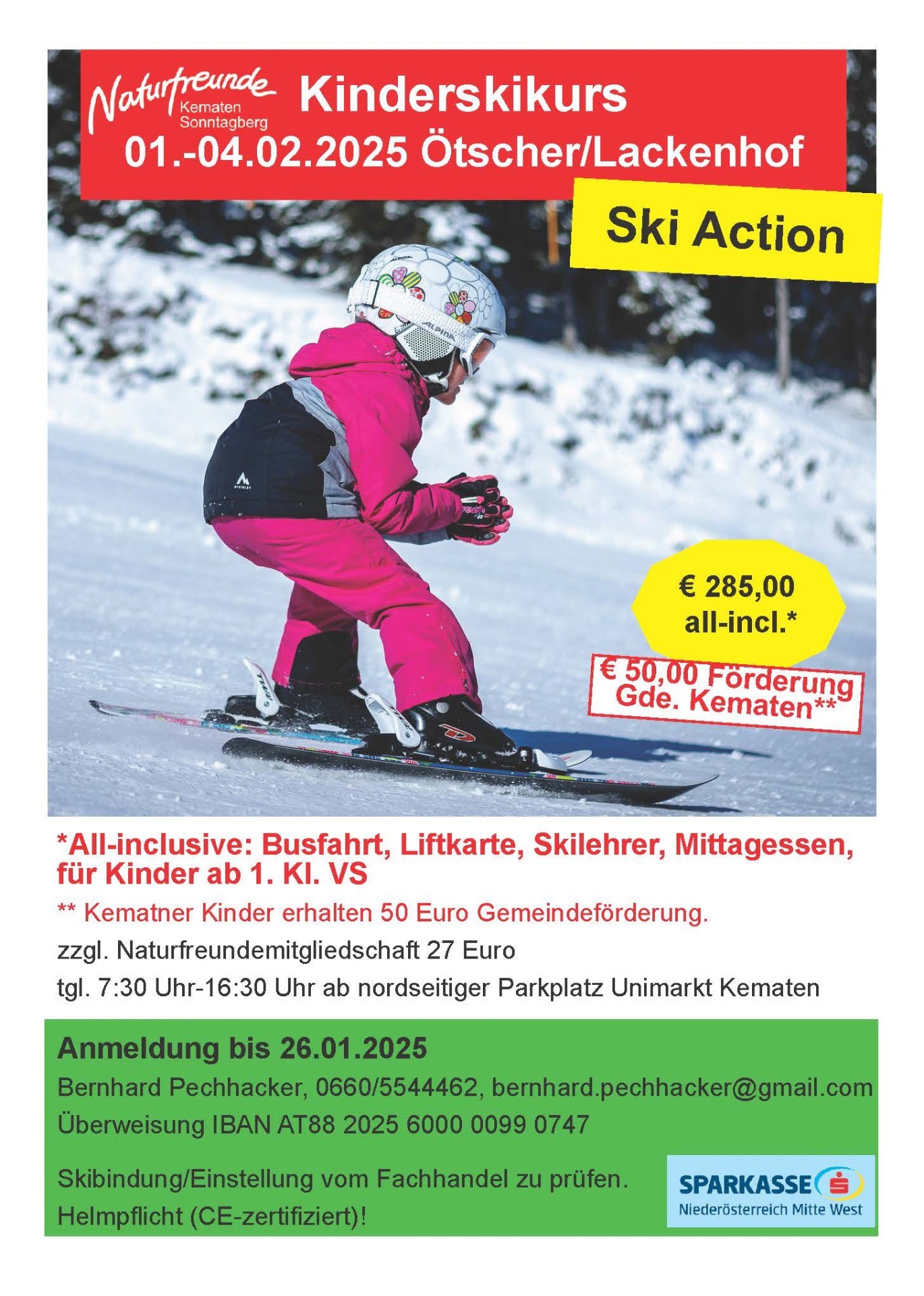 Der Skikurs ist das Fundament zum Skivergnügen! Gemeinsam in Bewegung und zum Fahrspaß. Die Freude am Wintersport zusammen in einer traumhaften Winterlandschaft erleben und in einer Gruppe aufgenommen werden. Das und noch viel mehr bietet auch heuer wieder die Naturfreunde Ortsgruppe bei ihrem traditionellen Kinder Skikurs am Ötscher an. Teilnehmer der Wohnsitzgemeinde Kematen erhalten € 50,-- Subvention!
