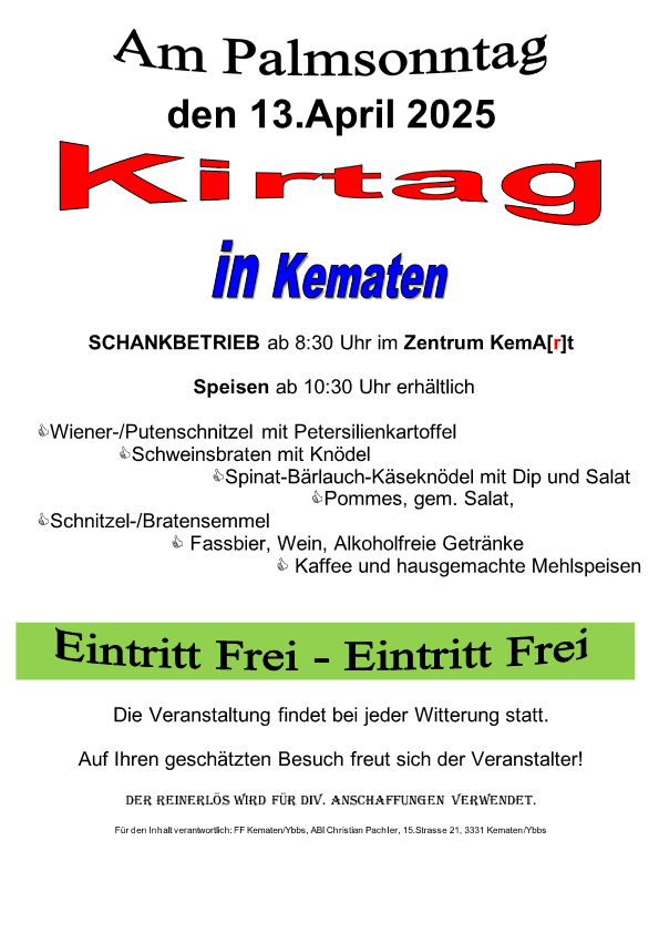 Immer am Palmsonntag findet in Kematen der Kirtag statt. Marktfahrer und Gewerbetreibende präsentieren ihre Waren und bieten Sie zum Verkauf an. Die FF Kematen verköstigt sie mit Getränke und Speisen.Kirtag mit Ausschank und Speisen im Zentrum Kem[Art]