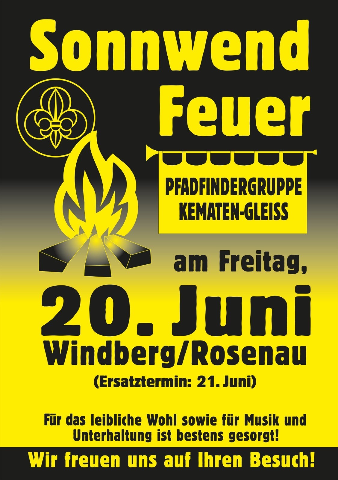 Auch heuer findet wieder unser traditionelles Sonnwendfeuer am 20. Juni in Windberg/Rosenau statt. Für das leibliche Wohl und gute Unterhaltung ist gesorgt. Auf zahlreiches Erscheinen freuen sich die Pfadfinder Kematen-Gleiß! Gut Pfad!