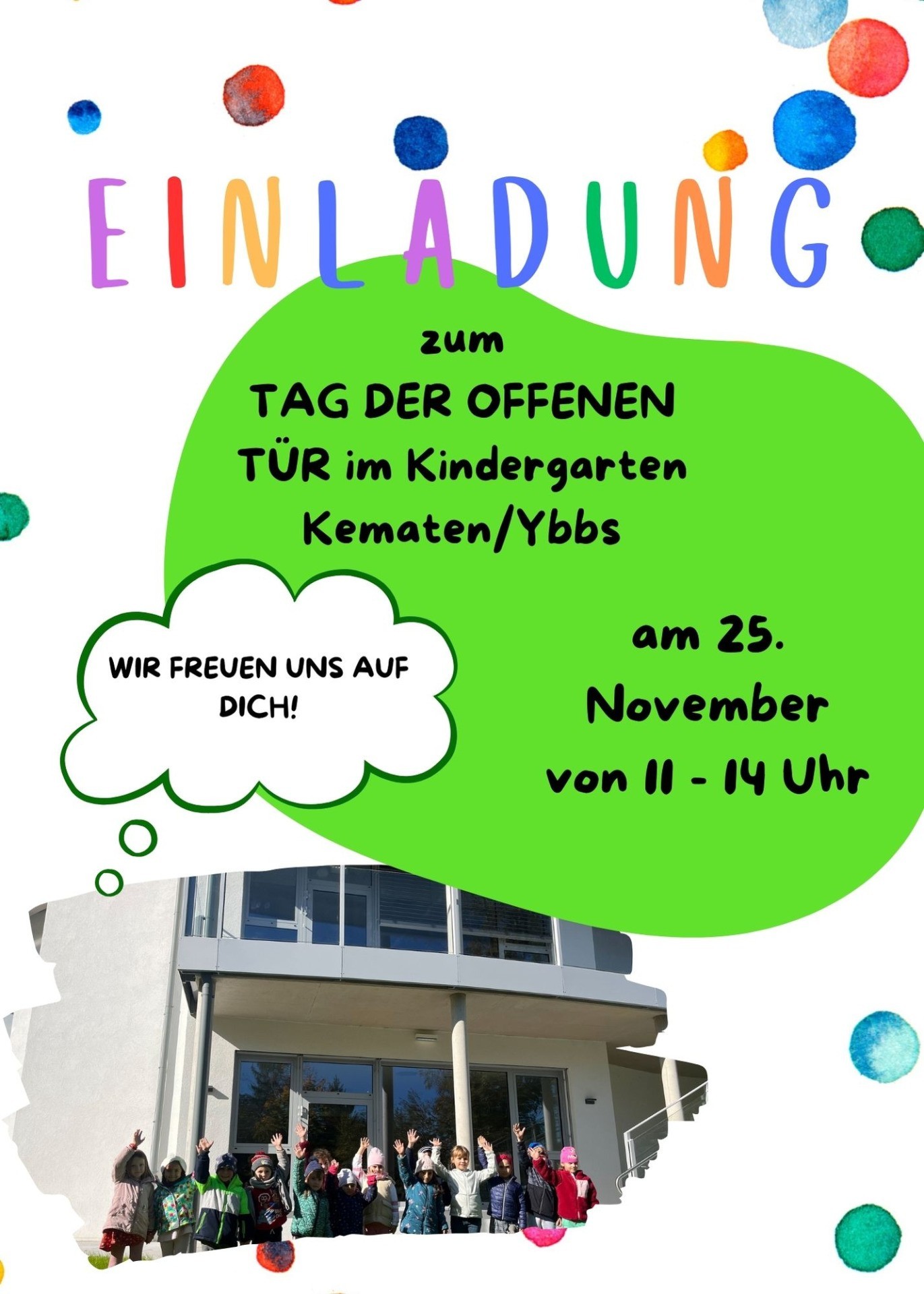Die Marktgemeinde Kematen/Ybbs lädt herzlich zur Eröffnung des Kindergartenzubaues und der neuen Tagesbetreuungsstätte ein. Ab 9:30 Uhr sind alle Angehörigen der Kindergartenkinder zur feierlichen Eröffnung und Segnung eingeladen. Um 11:00 Uhr öffnet der Kindergarten dann für alle Interessierten seine Türen.