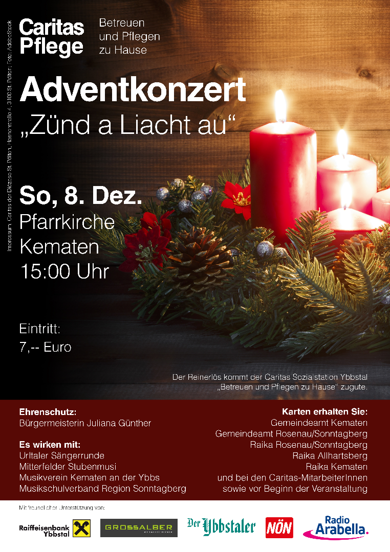 Die ARGE Caritas lädt zum traditionellen Adventkonzert in der Pfarrkirche Kematen ein. Ein stimmungsvoller Nachmittag für alle Musikliebhaber!