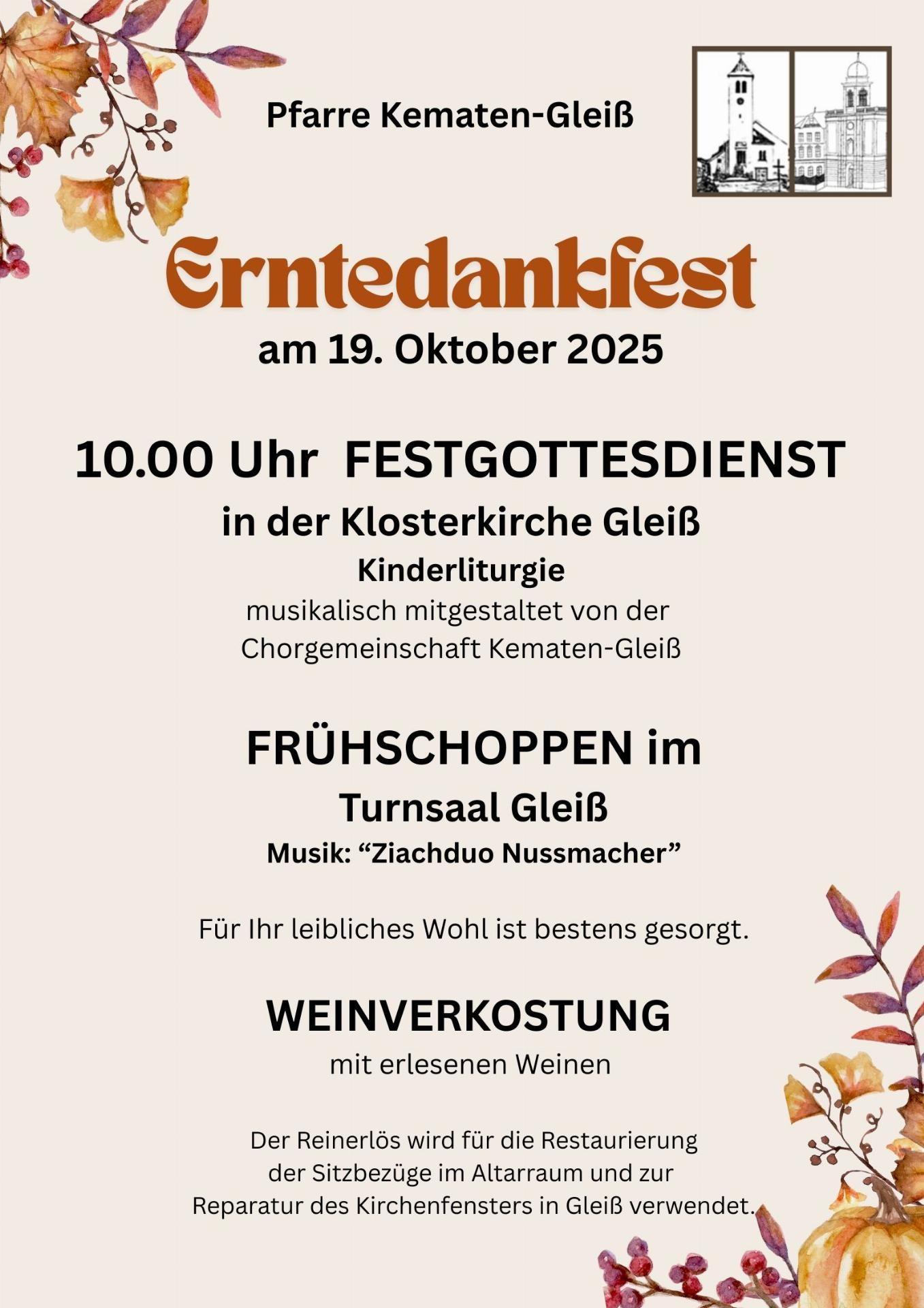 10.00 Uhr Festgottesdienst in der Klosterkirche Gleiß Kinderliturgie musikalisch mitgestaltet von der Chorgemeinschaft Kematen-Gleiß Frühschoppen im Turnsaal Gleiß