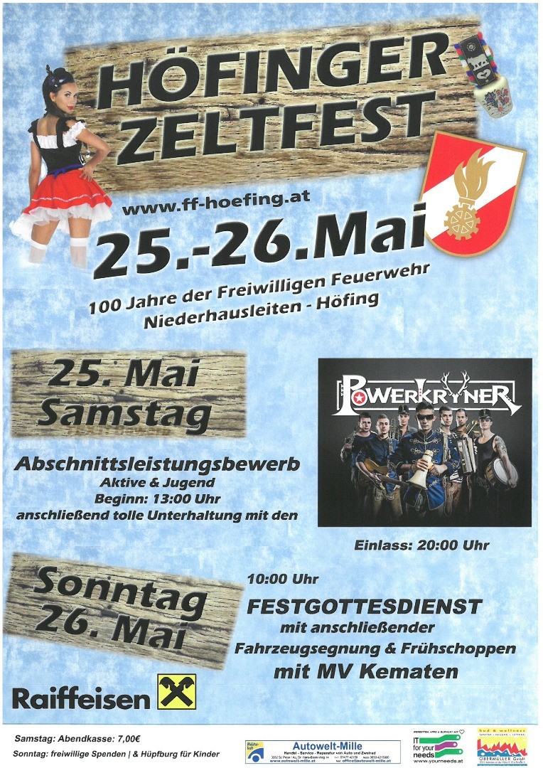Zum 100-jährigen Bestandsjubiläum lädt die FF-Höfing zum Zeltfest mit umfangreichem Rahmenprogramm ein.