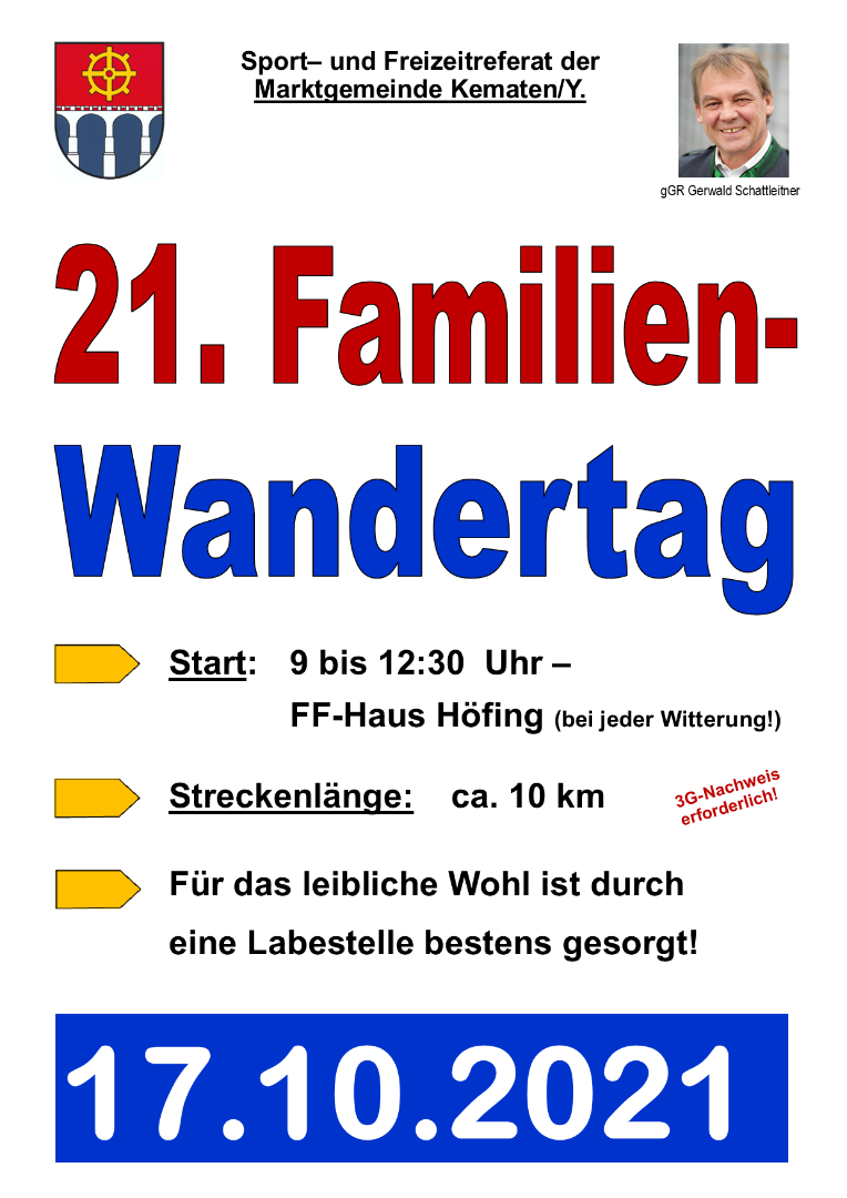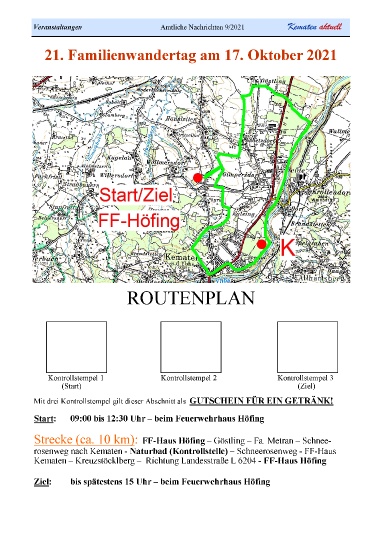 Unter dem Motto „Mitmachen – gesund bleiben – fit halten!“ lädt das Sport- und Freizeitreferat zur Teilnahme am 21. Kematner Familienwandertag herzlich ein! Rund um Kematen/Ybbs lässt sich die landschaftliche Schönheit des Mostviertels im Herbst eindrucksvoll erleben. Bitte beachten Sie, dass eine Teilnahme nur unter Einhaltung der aktuell gültigen gesetzlichen Corona-Regelungen möglich ist.