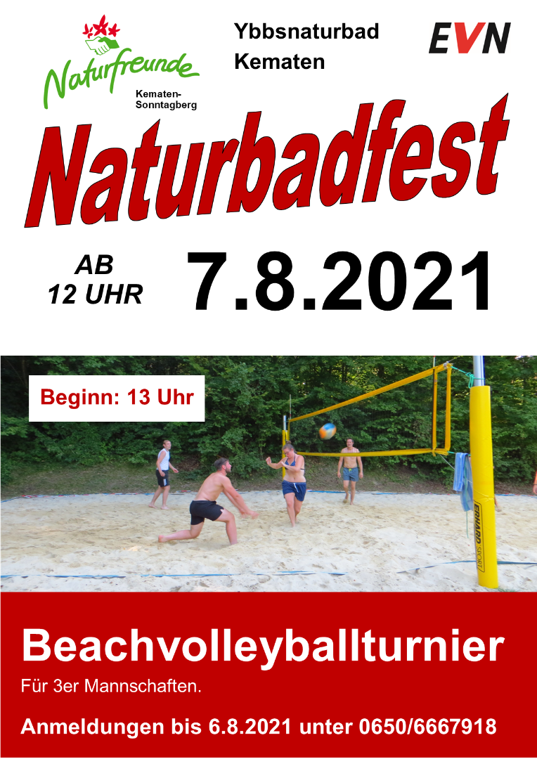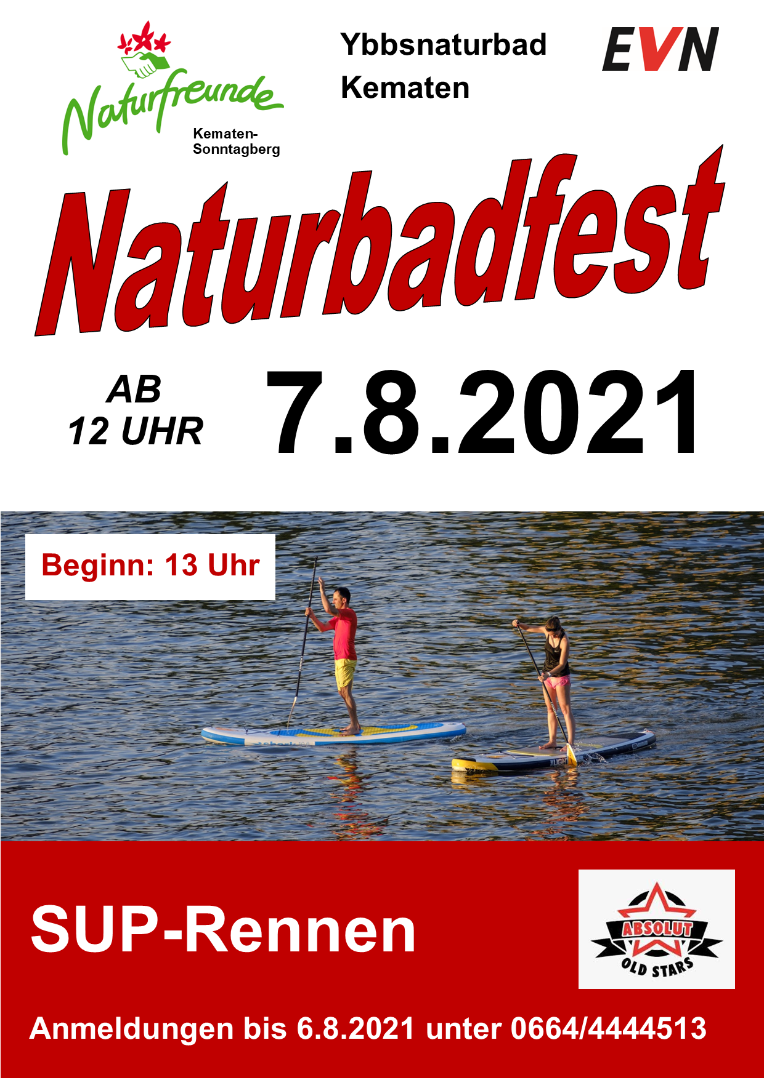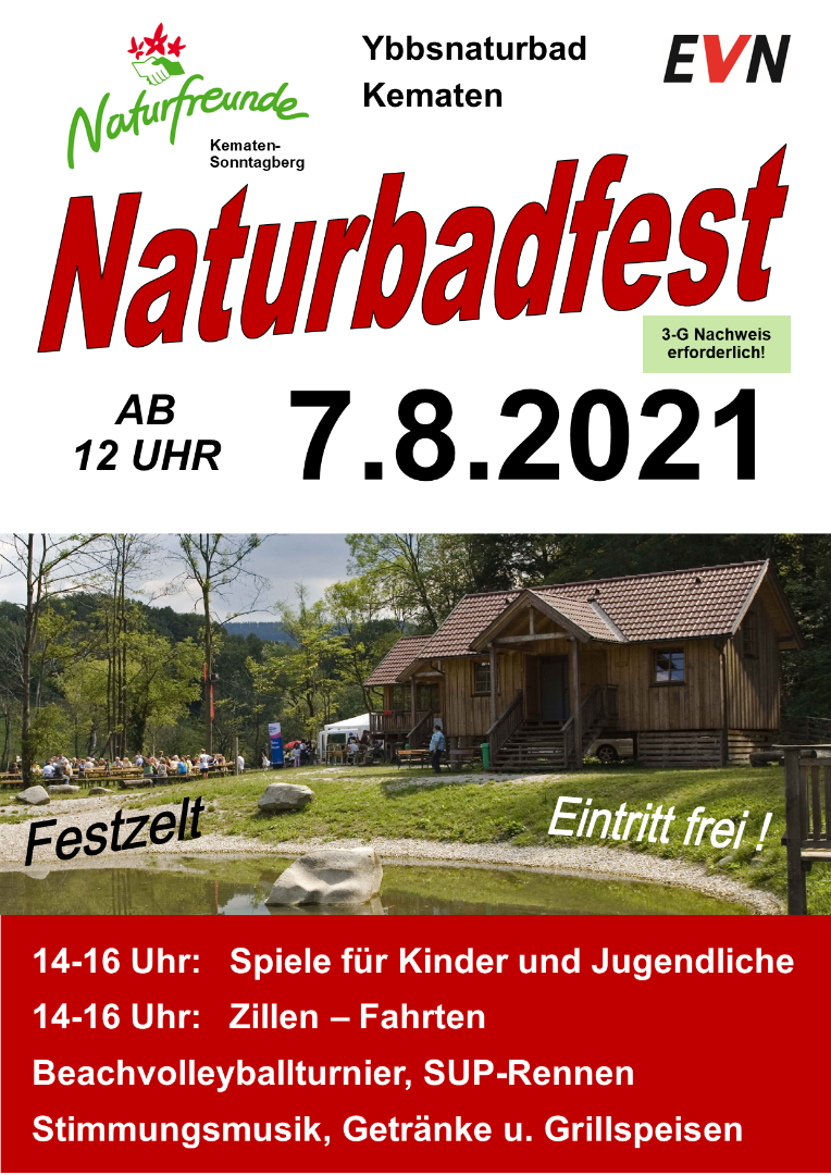 Die Naturfreunde laden zu einem unterhaltsamen Nachmittag beim traditionellen Naturbadfest ein. Spiele für Kinder und Jugendliche in und am Wasser, betreute Zillenfahrten sowie ein Beachvolleyballturnier für Hobbymannschaften (3er Mannschaften. Beginn: 13 Uhr. Anmeldungen unter: bis 6.8.2021 unter 0650/6667918) und ein SUP-Bewerb (Anmeldungen bis 6.8.2021 unter 0664/4444513) bieten ein abwechslungsreiches Rahmenprogramm für Jung und Alt. Für das leibliche Wohl und Stimmungsmusik ist bestens gesorgt! Bitte beachten Sie, dass eine Teilnahme nur mit aktuellem 3-G Nachweis möglich ist.