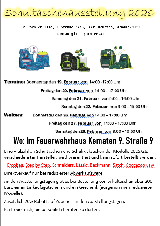 Termine: Donnerstag den 19. Februar von 14:00 -17:00 Uhr Freitag den 20. Februar von 14:00 – 17:00 Uhr Samstag den 21. Februar von 9:00 – 16:00 Uhr Sonntag den 22. Februar von 9:00 – 15:00 Uhr Weiters: Donnerstag den 26. Februar von 14:00 – 17:00 Uhr Freitag den 27. Februar von 14:00 – 17:00 Uhr Samstag den 28. Februar von 9:00 – 16:00 Uhr Wo: Im Feuerwehrhaus Kematen 9. Straße 9 Eine Vielzahl an Schultaschen und Schulrucksäcken der Modelle 2025/26, verschiedenster Hersteller, wird präsentiert und kann sofort bestellt werden. Ergobag, Step by Step, Schneiders, Lässig, Beckmann, Satch, Coocazoo usw Direktverkauf nur bei reduzierter Abverkaufsware. An den Ausstellungstagen gibt es bei Bestellung von Schultaschen über 200 Euro einen Einkaufsgutschein und ein Geschenk (ausgenommen reduzierte Modelle). Zusätzlich 20% Rabatt auf Zubehör an den Ausstellungstagen. Ich freue mich, Sie persönlich beraten zu dürfen.Schultaschen, Schulrucksäcke, Kindergartentasche/rucksack Ausstellung