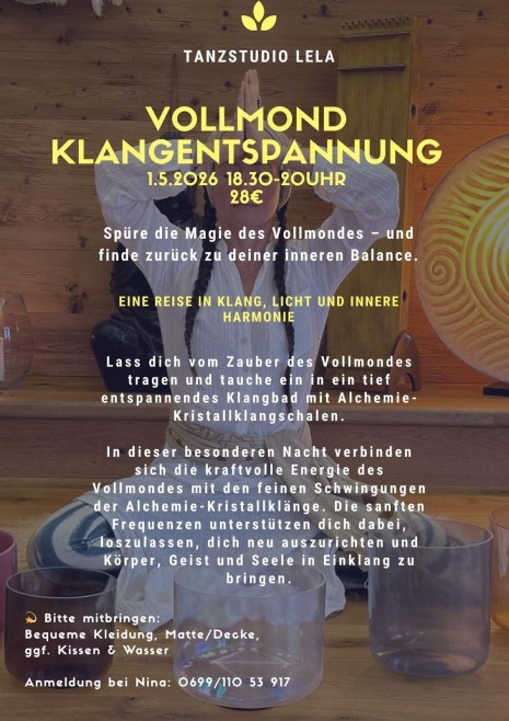 Lass dich vom Zauber des Vollmondes tragen und tauche ein in ein tief entspannendes Klangbad mit Alchemie-Kristallklangschalen. Die sanften Frequenzen unterstützen dich dabei loszulassen, dich neu auszurichten und Körper, Geist und Seele in Einklang zu bringen.Eine Reise in Klang, Licht und innere Harmonie