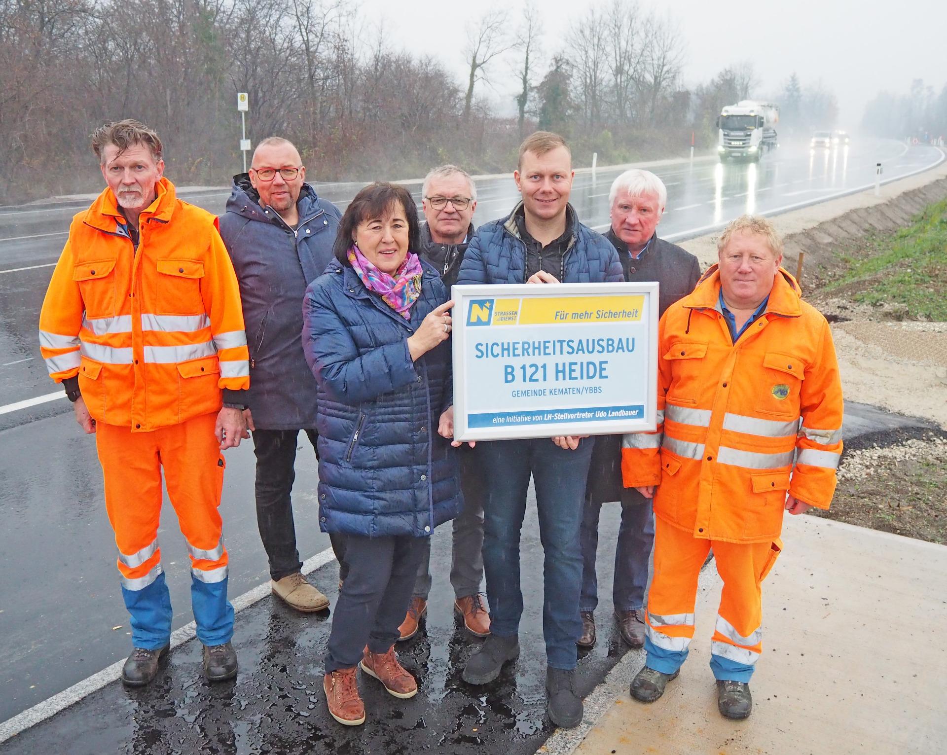 Die Landesstraße B 121 im Bereich „Heide“ in Kematen an der Ybbs wurde durch den Ausbau auf einer Länge von rund 1,0 km verkehrssicherer gestaltet. Am 17. November 2025 hat LAbg. Alexander Schnabel in Vertretung von LH-Stellvertreter Udo Landbauer gemeinsam mit Bürgermeisterin Juliana Günther und dem Leiter der NÖ Straßenbauabteilung Amstetten, DI Franz Stiedl, die Fertigstellung für den Sicherheitsausbau B 121 „Heide“ in Kematen an der Ybbs vorgenommen. Der Sicherheitsausbau 2025 umfasste die Errichtung von entsprechenden Linksabbiege- und Rechtsabbiegespuren im Zuge der B 121, sowie einer Beschleunigungspur von der L 6211 in die B 121 Richtung Kematen. Der Kreuzungspunkt mit Einbindung der L 6211 wurde dafür um ca. 150 m in Richtung Waidhofen/Ybbs zu einer bestehenden Zufahrt in ein Gewerbegebiet verschoben. Diese Maßnahme ermöglichte die Errichtung eines verkehrssicheren RVS-konformen Verkehrsknotens unter Reduzierung der Zufahrten direkt in die B 121. Gleichzeitig wurde durch die Gemeinde eine Rad- und Gehwegunterführung zur sicheren Querung der B 121 für Fußgänger und Radfahrer errichtet, die auch eine Verbindung zum Wanderweg (Schneerosenweg) darstellt. Für 2026 ist der Ausbau der Kreuzung mit der L 6214 / Zufahrt Metran von km 10,1 bis 10,63 geplant. Von den rund € 1.130.000,- Gesamtbaukosten des Bauabschnittes 2025 werden vom Land NÖ rund € 800.000,-- und von der Marktgemeinde Kematen/Ybbs rund € 330.000,-- getragen. Der NÖ Straßendienst bedankt sich bei den Verkehrsteilnehmerinnen und Verkehrsteilnehmer für ihr Verständnis während den Bauarbeiten.