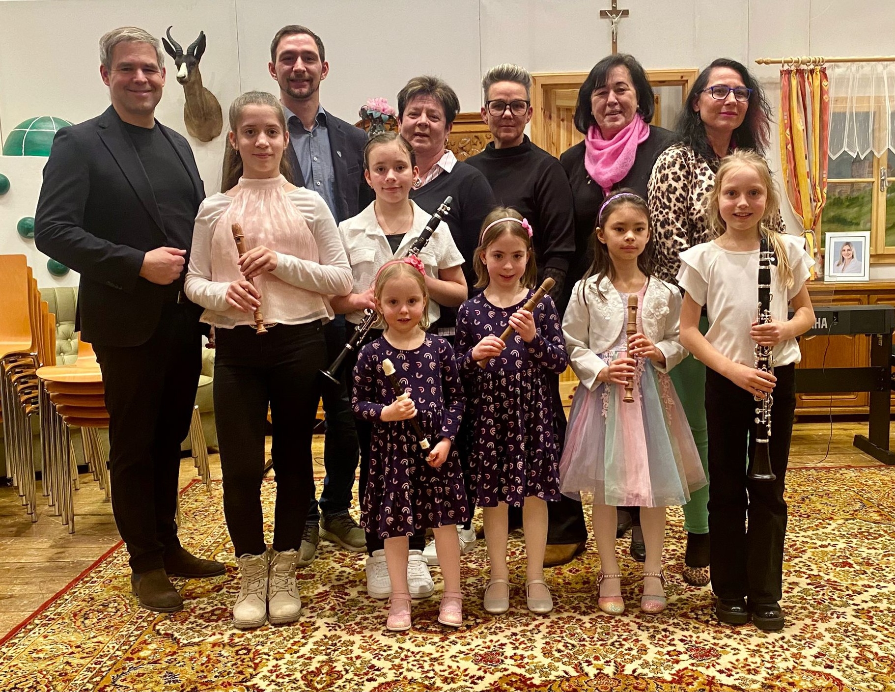 Foto: MSL Hubert Kerschbaumer GR. Philipp Brandstetter Vbgm. Heidi Polsterer Lucia Scherzenlehner Bgm. Juliana Günther GR. Hannelore Grem mit Schülern des Musikschulverbandes