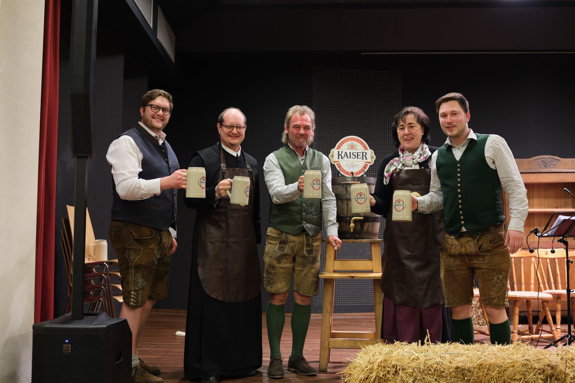 Foto vlnr: Kapellmeister Martin Bachner, Pfarrer P. Vitus Weichselbaumer, GGR Gerwald Schattleitner, Bgm. Juliana Günther und Obm. Georg Grissenberger beim Starkbieranstich
