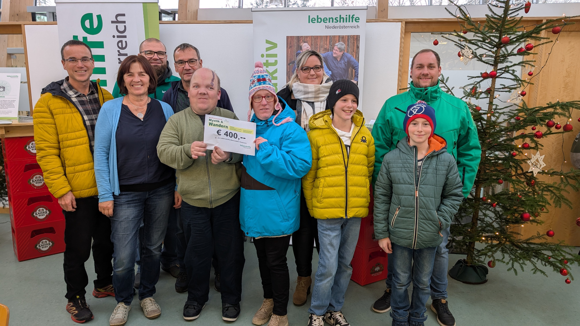 Der stimmungsvolle Adventmarkt der Lebenshilfe Hiesbach diente als Rahmen, um feierlich die Spenden der Benefizveranstaltung Mystik & Wandern zu übergeben. Die Naturfreunde Kematen-Sonntagberg, die Pfarre Sonntagberg, der Musikverein Hilm-Kematen, der Pro.Musica Chor Böhlerwerk, der Aktiv Pferdestall Union Mostviertel und der Elternverein der VS Kematen sammelten bei der Wanderung am Sonntagberg im November 400 Euro für den guten Zweck. „Wir wollen damit Menschen mit Beeinträchtigungen helfen, dass auch sie etwa Ausflüge in die Natur machen können und diese erleben können“, so Naturfreundeobmann Markus Haselhofer. Herzlichen Dank den teilnehmenden Vereinen, der Pfarre Sonntagberg und allen, die zum Erfolg dieses großartigen Events beigetragen haben.