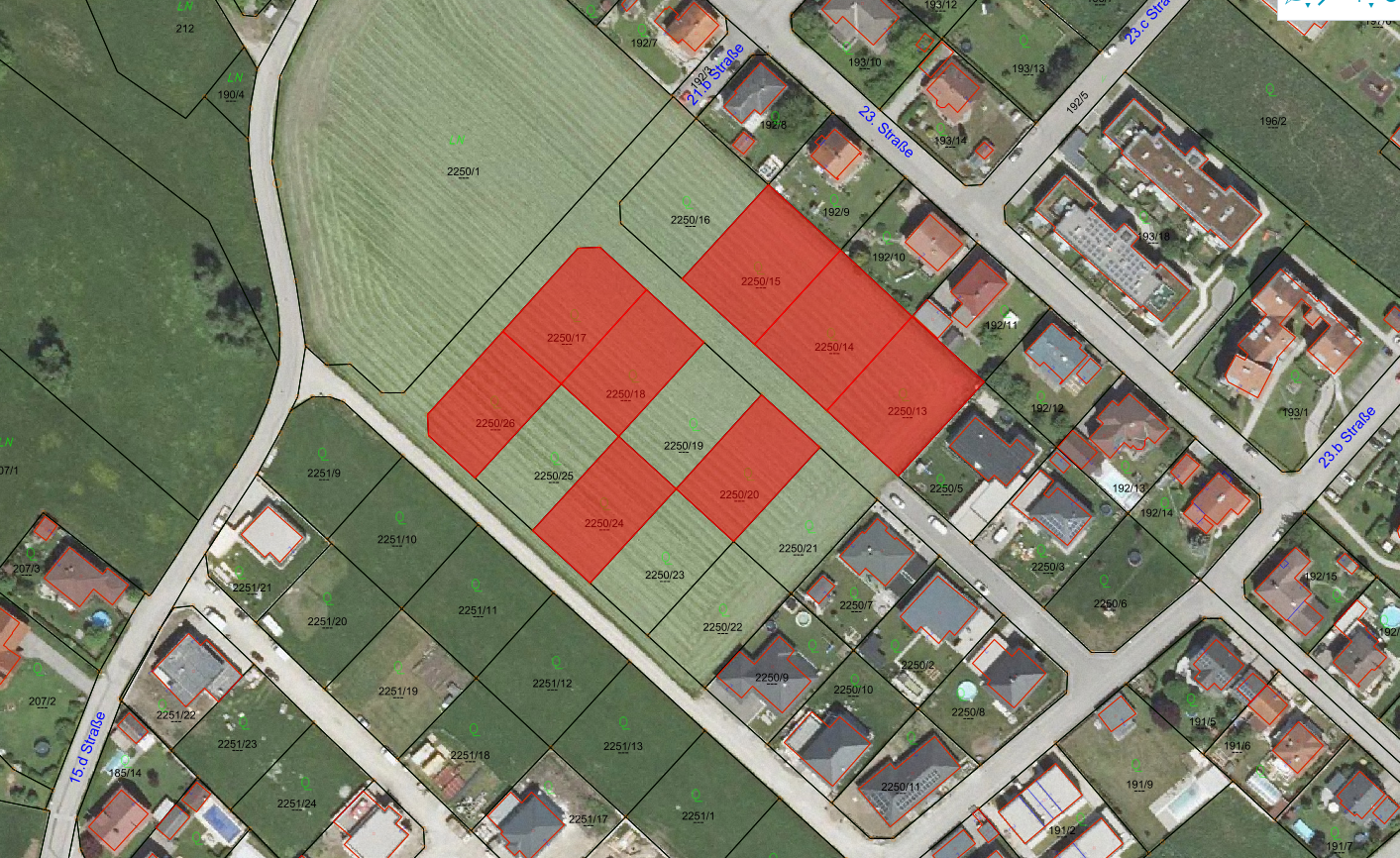 Die rot markierten Grundstücke sind zum Kauf verfügbar.
