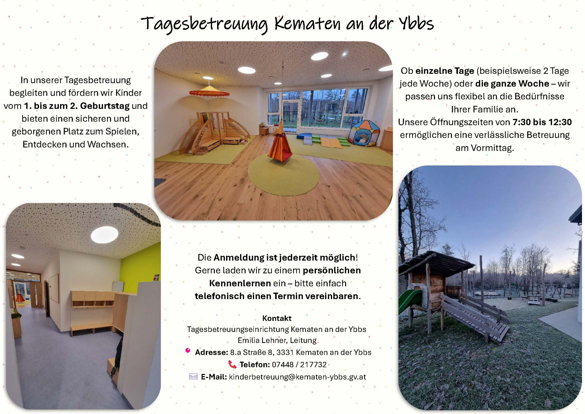 Die Marktgemeinde Kematen an der Ybbs bietet die Kleinkinder Tagesbetreuungseinrichtung „KNOPFERLSTUBE“ an. Wir betreuen und fördern Kinder im 2. Lebensjahr, bei Bedarf auch nachmittags. Wir sind bemüht, dem sozialen Verhalten in der Gruppe und den individuellen Bedürfnissen Ihres Kindes besondere Aufmerksamkeit zu schenken.
